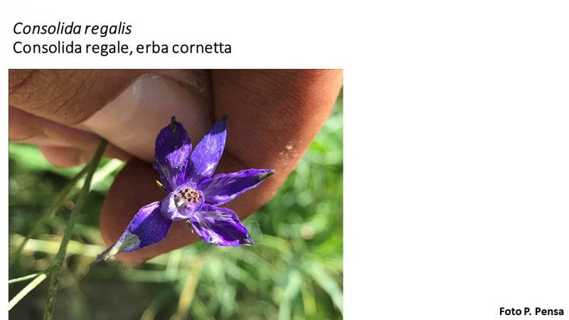 Angiosperma: dicotiledoni Fam.Ranunculaceae Specie:C. regalis Forma biologica: terofita (Th) Ciclo di vita: annuale Altezza: 20-40 cm Apparato radicale: fittonante Fusto: eretto, angoloso Foglie: ternato-pennatosetta Fiore: pannocchia corimbosa, un tepalo a forma di sperone, azzurro violetti Frutto: follicolo Antesi: maggio-giugno Habitat: campi coltivati, margini di strade