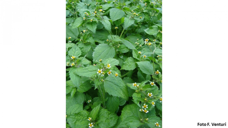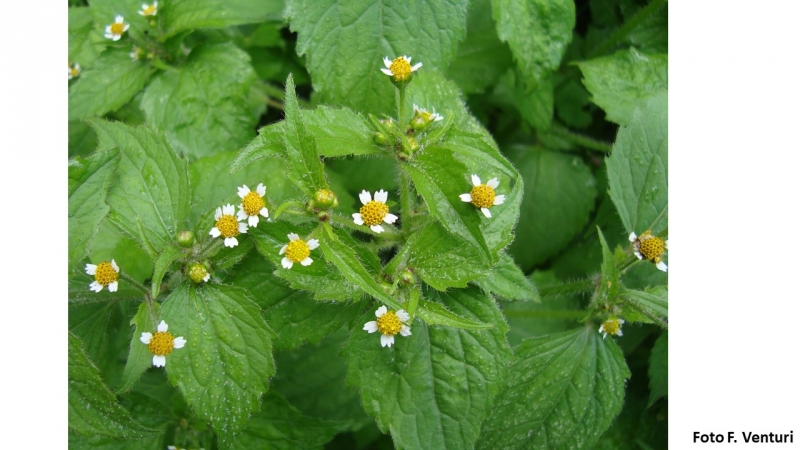 Fam. Composite Specie:G. parviflora Forma biologica: terofita scaposa (Th) Ciclo di vita: annuale Altezza: 10-50 cm Apparato radicale: fascicolato Fusto: eretto, striato con peli semplici sparsi Foglie: opposte, picciolate, con lamina lanceolata, acuminata e margine dentellato Fiore: capolini piccoli, peduncolati con pochi fiori ligulati bianchi e 30-50 fiori tubulosi gialli al centro Frutto: achenio Antesi: maggio-ottobre Habitat: incolti, siepi, zone umide, aiuole