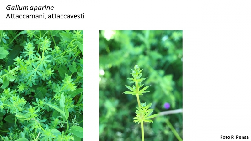 Angiosperma: dicotiledone Fam.Rubiaceae Specie:G. aparine Forma biologica: terofita (Th) Ciclo di vita: annuale Altezza: 20-150 cm Apparato radicale: fittonante Fusto: angolo, prostrarti o rampicanti, scabri per la presenza di aculei Foglie: lineari-lanceolate o ellittiche, spinose sul bordo e nervatura centrale Fiore: cime ascellari, corolla verde-biancastra Frutto: mericarpi Antesi: marzo-settembre Habitat: siepi, campi coltivati, incolti