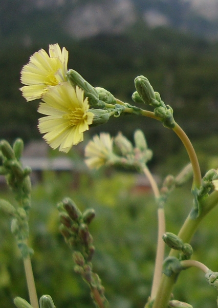 Fiore: infiorescenza con pannocchia terminale avvolta in u involucro piriforme; i fiori sono ligulati di colore giallo, formati da cinque petali e 5 stami fusi insieme alle antere