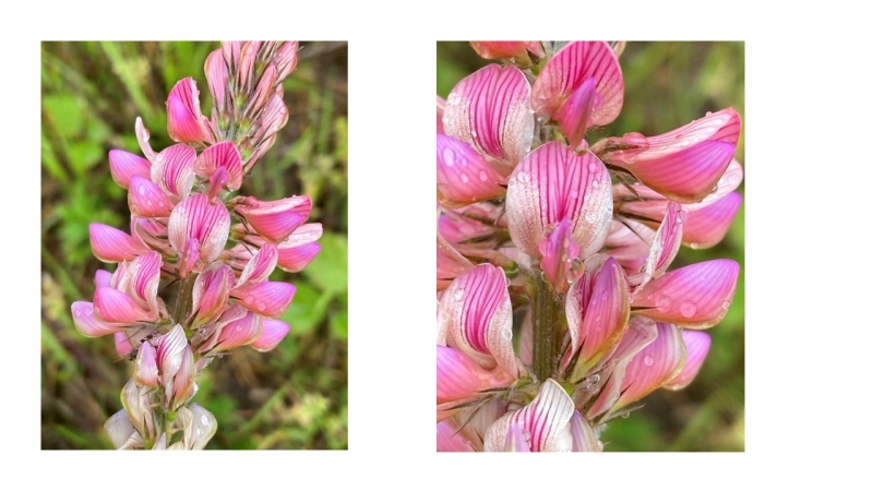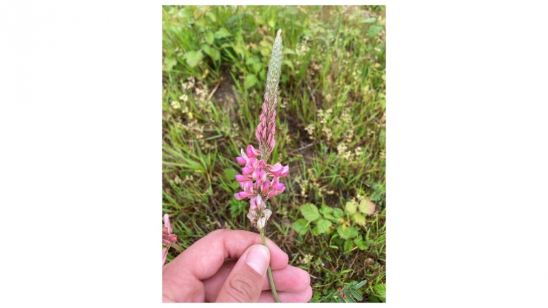 Fiore: infiorescenza in racemi piramidali, corolla papilionacea violacea con venature porporine; vessillo sub eguale alla carena