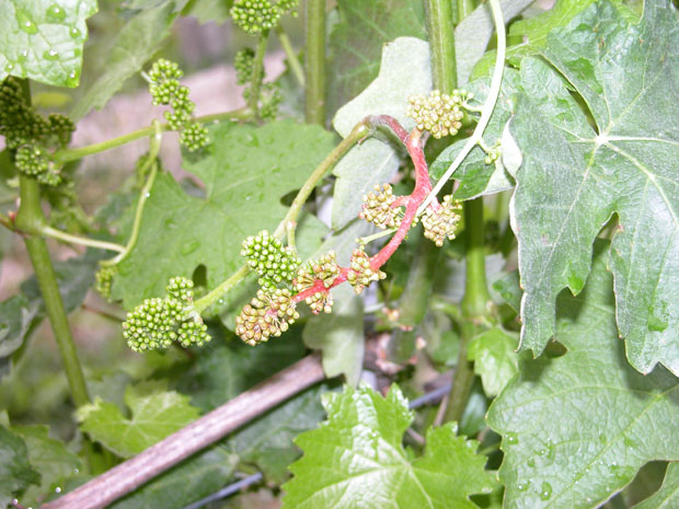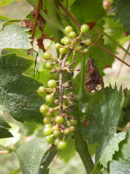 Sintomi su grappolo. I giovani grappolini, ancora allo stadio fiorale, sono molto suscettibili alla malattia. In alcuni casi le primissime infezioni stagionali, qualora molto precoci, possono mostrarsi prima sul grappolo che non sulla foglia. Il frutto assume una caratteristica incurvatura ad uncino, accompagnata da un arrossamento del rachide, prima dell’emissione della classica muffa biancastra. Sino alla fase di ingrossamento acini, il grappolo resta molto sensibile a P. viticola, che può anche disseccare completamente le bacche. Nel prosieguo della stagione la chiusura degli stomi che avviene a carico dell’acino lo rende sempre meno sensibile alla malattia che può ancora penetrare all’interno della bacca passando attraverso il pedicello, ma non è in grado di evadere i corpi fruttiferi. L’acino colpito assume un aspetto plumbeo. È la cosiddetta “peronospora larvata”.