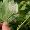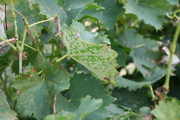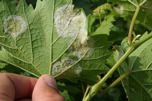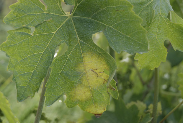 Sintomi su foglia. Come accennato in precedenza le foglie perché possano essere infette devono avere stomi recettivi. Il primo e caratteristico sintomo di P. viticola è una colorazione giallognola presente sulla pagina fogliare superiore, quasi perfettamente circolare, denominata in gergo “macchia d’olio”. Dopo alcuni giorni (in funzione di umidità e temperatura), nella parte inferiore della foglia, in corrispondenza della macchia d’olio, viene emessa una muffa bianca che rappresenta i corpi fruttiferi del fungo. A questo punto, se non viene inibita, la malattia può progredire anche rapidamente sino ad interessare l’intera lamina fogliare che necrotizza prima di cadere a terra.