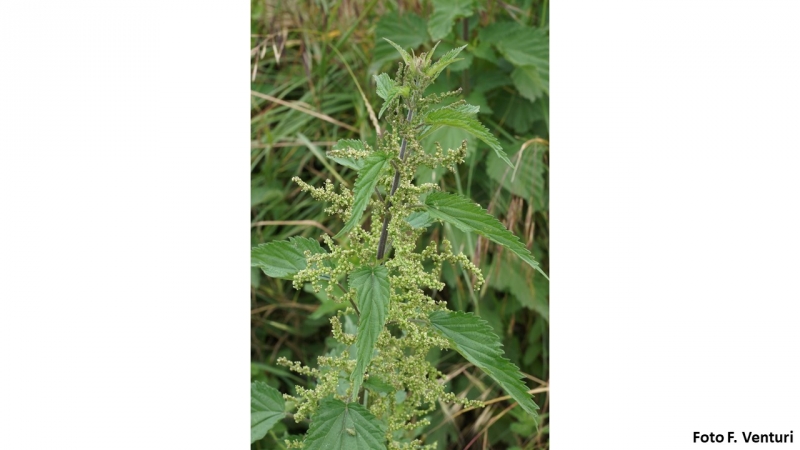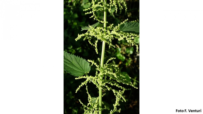 Angiosperme: dicotiledone Fam. Urticaceae Specie: U. dioica Forma biologica: emicriptofita scaposa (Hr) Ciclo di vita: poliennale-perenne Altezza: 30-120 cm Apparato radicale: radici secondarie a partire dal rizoma Fusto: ipogeo formato da un rizoma stolonifero; epigeo eretto, scalanato, di coloroe rossastro o giallastro e ricoperto di peli urticanti Foglie: opposte con picciolo lungo, ovali-lanceolate a margine dentato ricoperte di peli urticanti Fiore: amenti pendenti all'ascella delle foglie, pianta dioica, fiori apetali verdastri con quattro tepali Frutto: nucula Antesi: maggio-novembre Habitat: suoli ricchi di azoto, incolti, boschivi, zone d'ombra