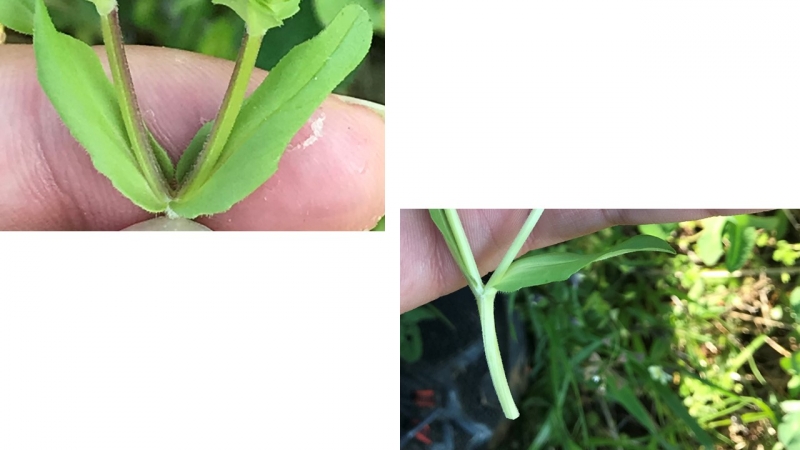 Foglie: basali picciolate, uninervie, spatolate a margine intero, le superiori ridotte, sessili e opposte a lamina elittica-spatolata